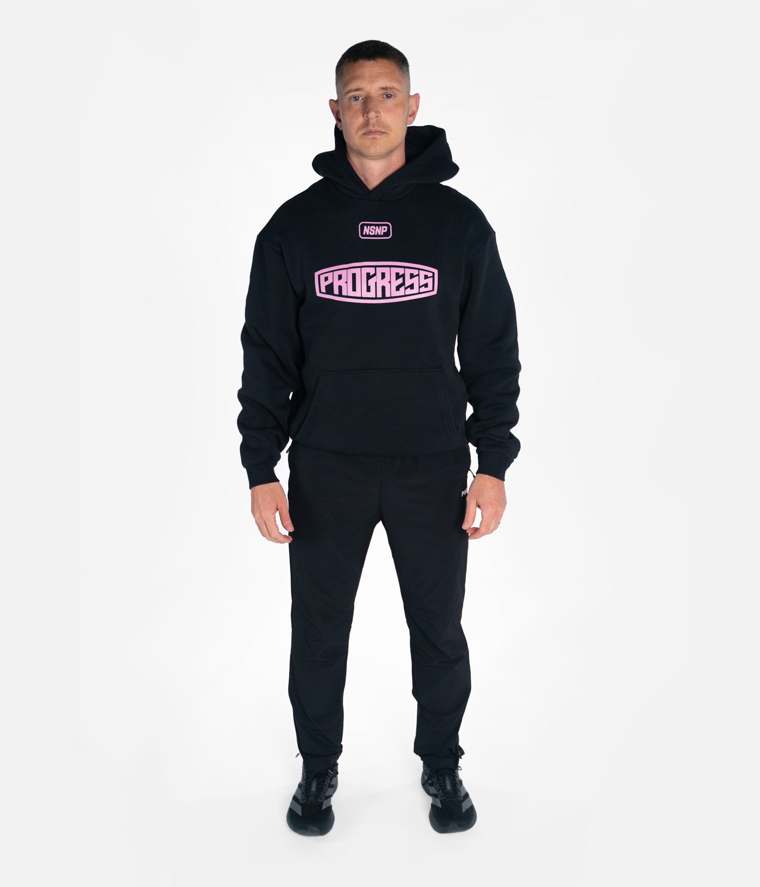 Designed with a dropped shoulder construction and an oversized fit, the hoodie maintains a clean, understated look. Bold pink Progress branding adds contrast to the base design, staying consistent with the Balance Series aesthetic. Made from a cotton and polyester blend, this hoodie is intended for regular, everyday use.